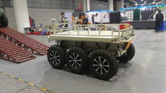 6×6純電動全地形車采用功率型鋰電池,外轉子電機直驅,搭載無人通信平臺,電子差速轉向。