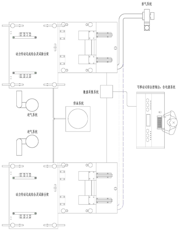 動力傳動組合試驗系統滿足綜合傳動裝置的相應出廠試驗要求和發動機、變矩器等組件進廠復驗的試驗要求。